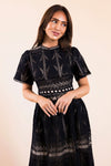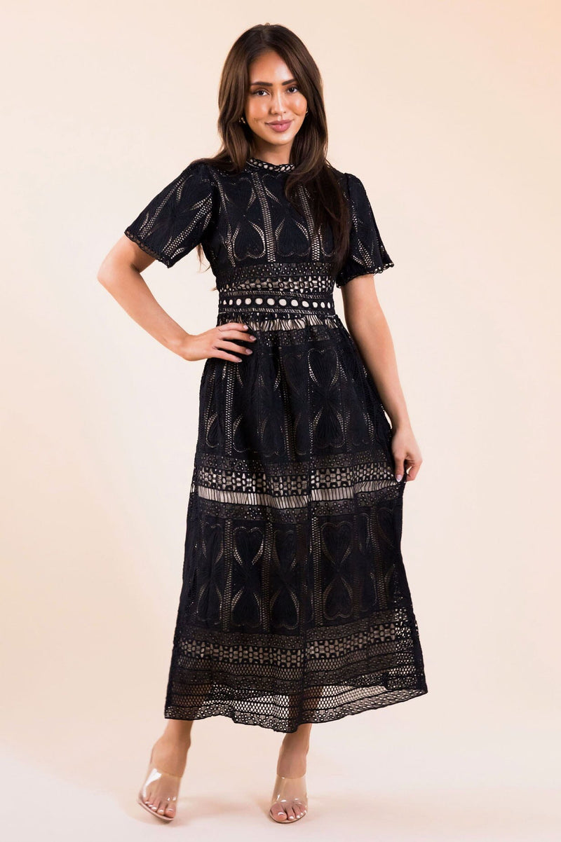 We are beyond in love with the breathtaking and stunning new dress! Beautiful black heart lace dress has a lovely feminine fit with short sleeves and a tea length skirt. Lined with a back zipper closure.