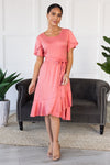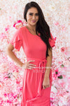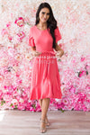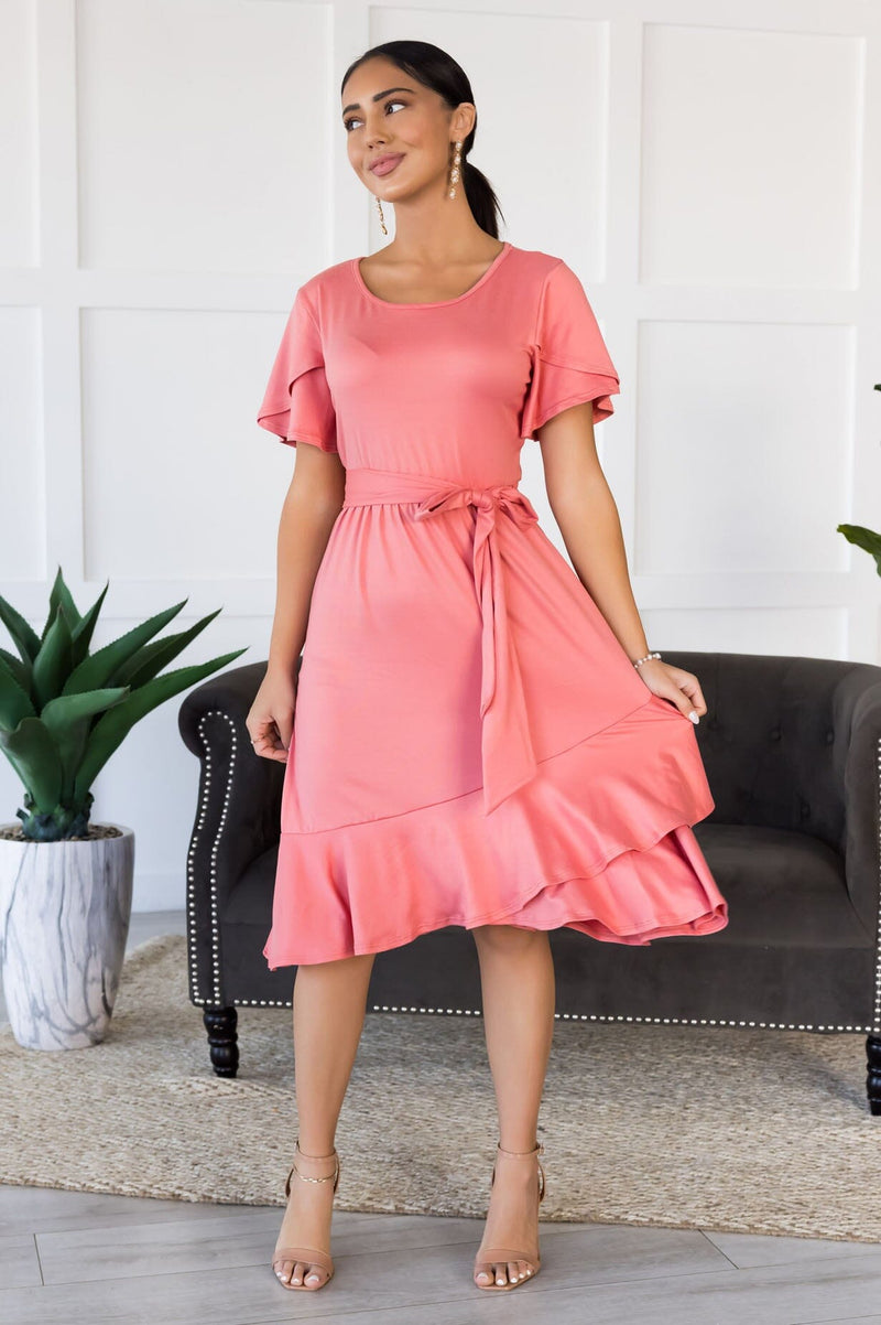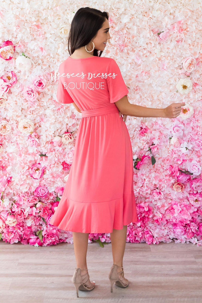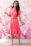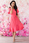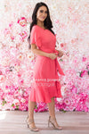 Our absolute new favorite! The Joan is perfection, this gorgeous mid-length dress features a modest round neckline, short cross flutter sleeves, cozy soft stretch material, belt tie waist and last but not least the darling faux wrap skirt! These will go quick, get yours before they are gone!