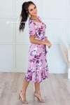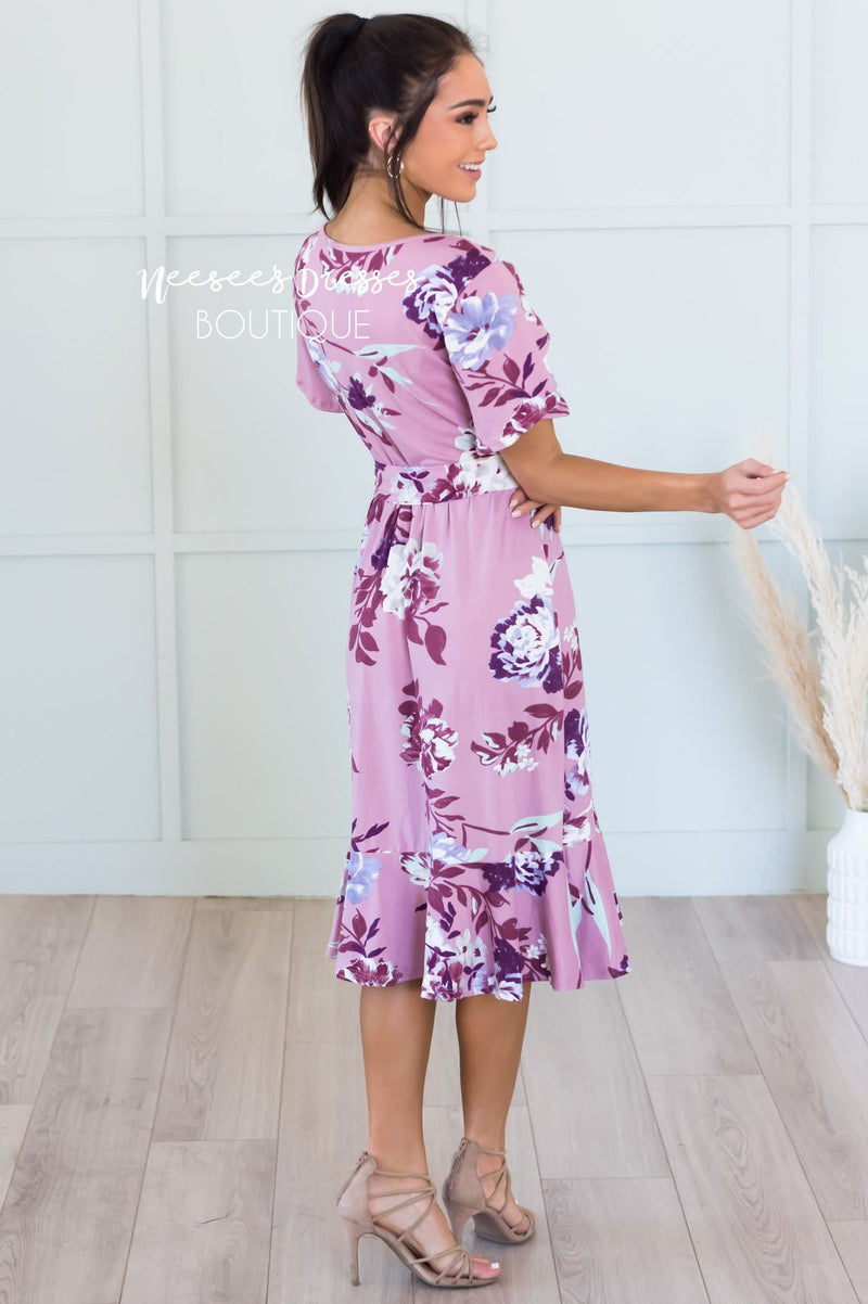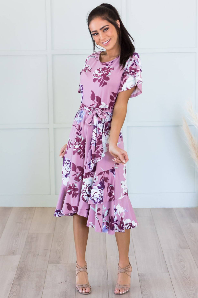 Our absolute new favorite! The Joan is perfection, this gorgeous mid-length dress features a modest round neckline, short cross flutter sleeves, cozy soft stretch material, belt tie waist and last but not least the darling faux wrap skirt! These will go quick, get yours before they are gone!