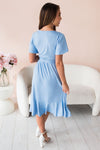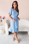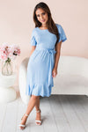 The Joan is absolute perfection! This gorgeous sky blue mid-length dress features a modest round neckline, short cross flutter sleeves, cozy soft stretch material, belt tie waist, and last but not least the darling faux wrap skirt! These will go quick, get yours before they are gone!