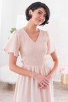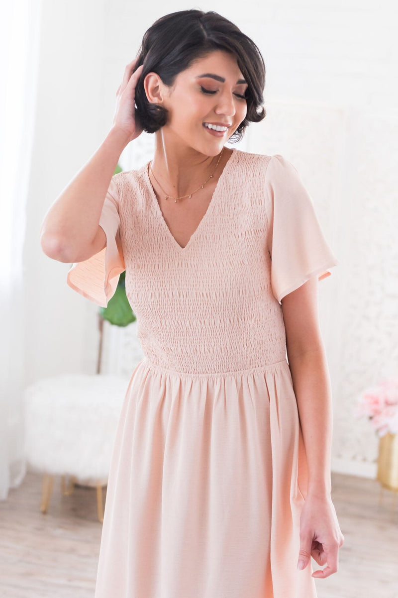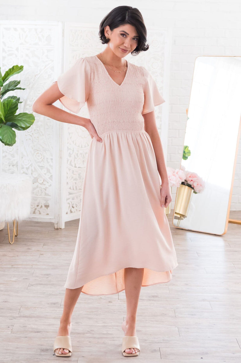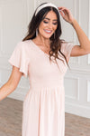 We fell in love with this darling peach smocked top dress the moment we saw it! With amazing features such as the stunning short flutter sleeves and flowy high-low skirt! Get yours today!