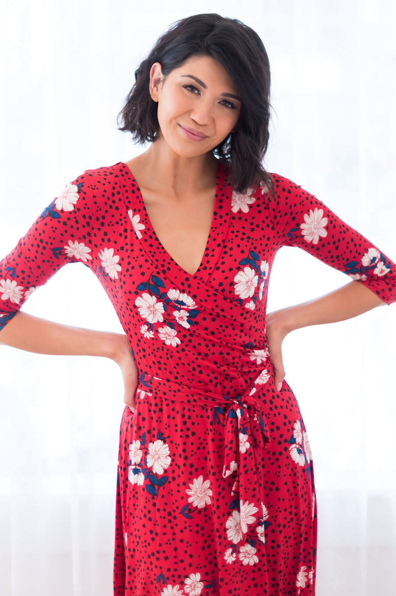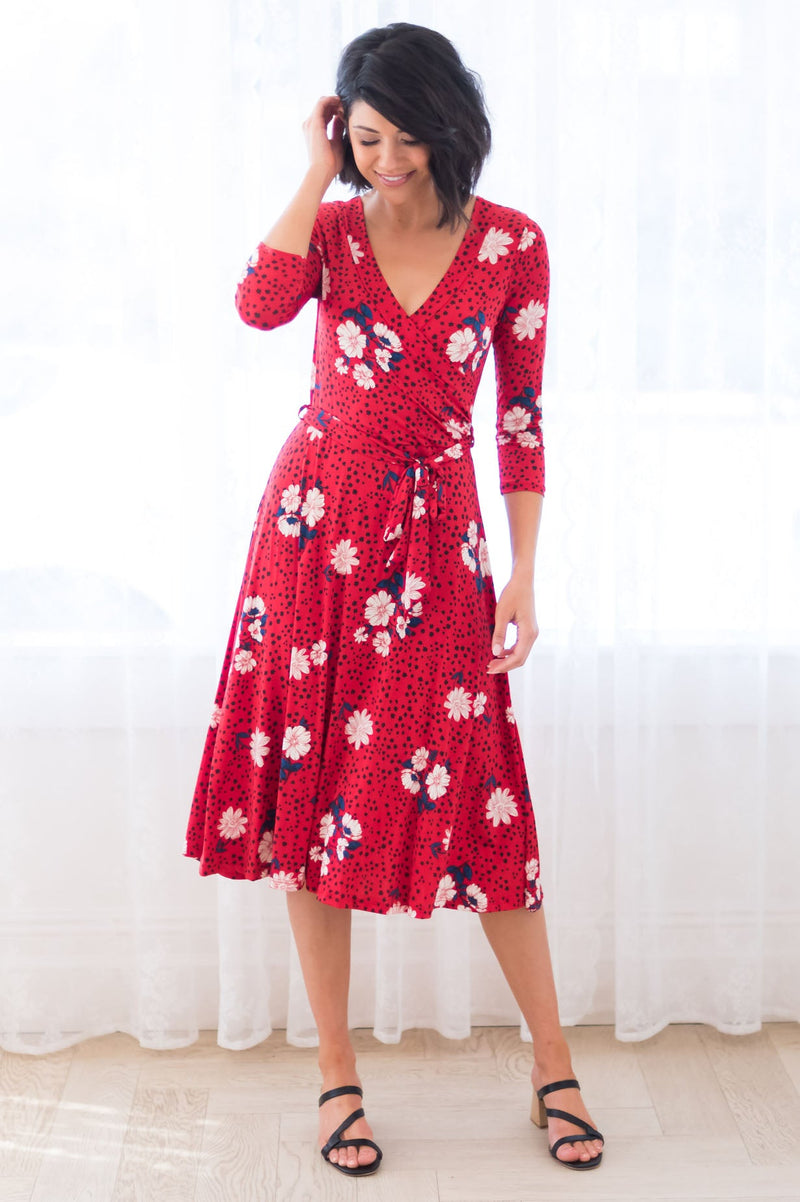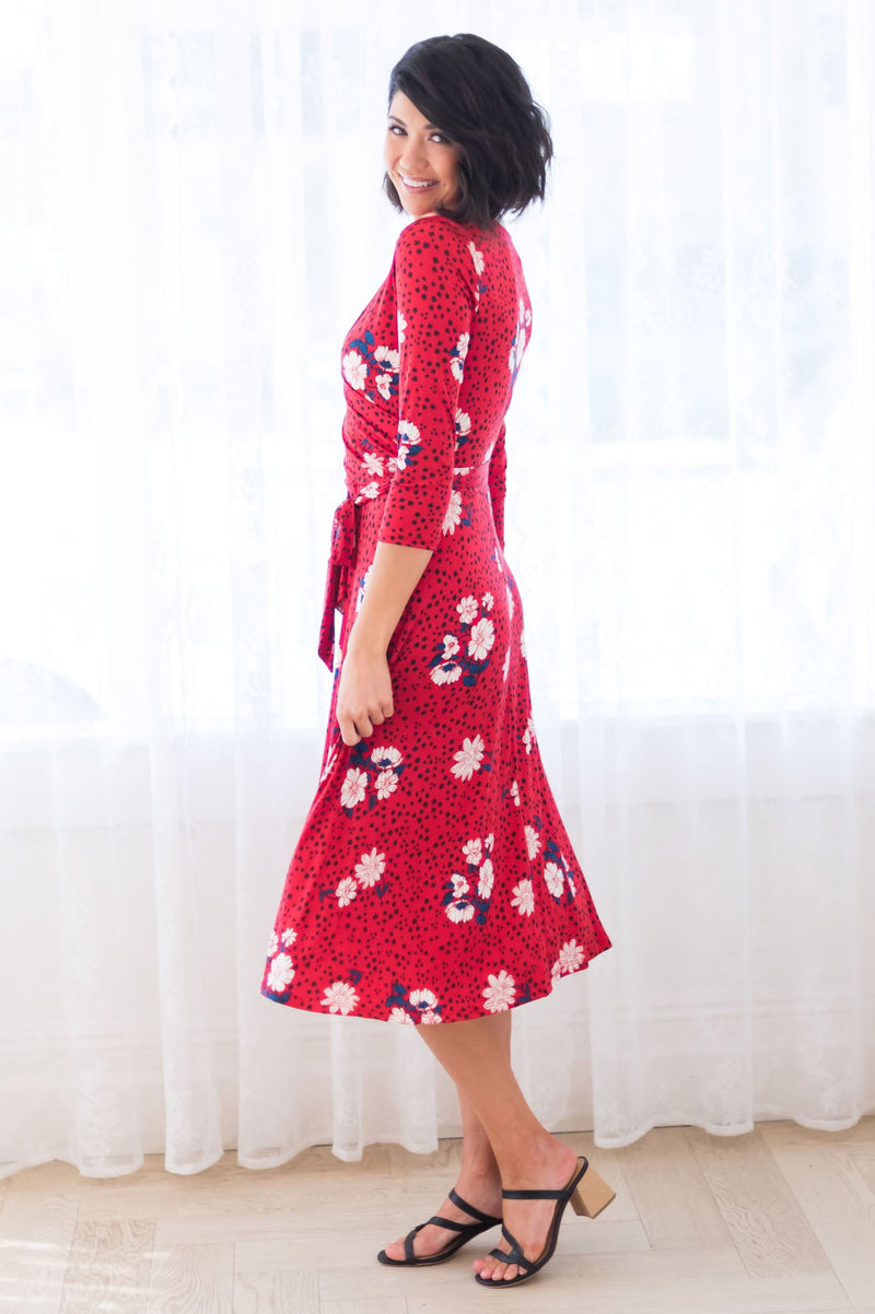Our new Jonna dress is absolutely stunning from head to toe! Featuring a modest cross-over bodice, making this one nursing friendly! The most beautiful ditzy floral print, 3/4 sleeves, midi length. You cannot go wrong with this beauty. Get yours today before they are all gone.