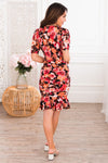 You will light up the room the second you walk in with the new, modest, Jori Jane dress! This darling feminine beauty is bound to catch everyone's eye. Features include, trendy ruched fitted skirt with ruffle hem detailing, cross-over neckline, short sleeves and one of a kind red tropical floral print.
