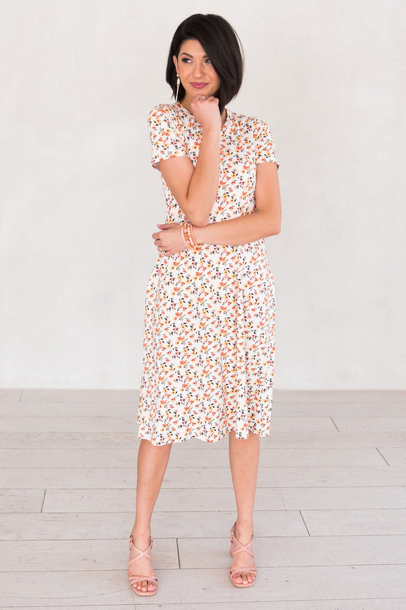 We cannot get enough of modest swing dresses! Especially ones with gorgeous floral and pockets! This cute swing dress features; shorts sleeves, round modest neckline, pockets, buttery soft material, the perfect midi length. These beauties are going to fly out of our boutique faster than they came in so be sure to snag yours!