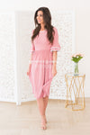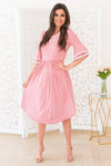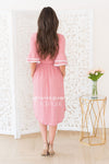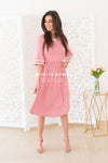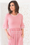 The Joss is one of our new favorites! This classy feminine mid-length dress is sure to flatter! Featuring a white trim round neckline and flowy double bell half sleeves, elastic waist and pockets! You simply can not go wrong with this beauty!