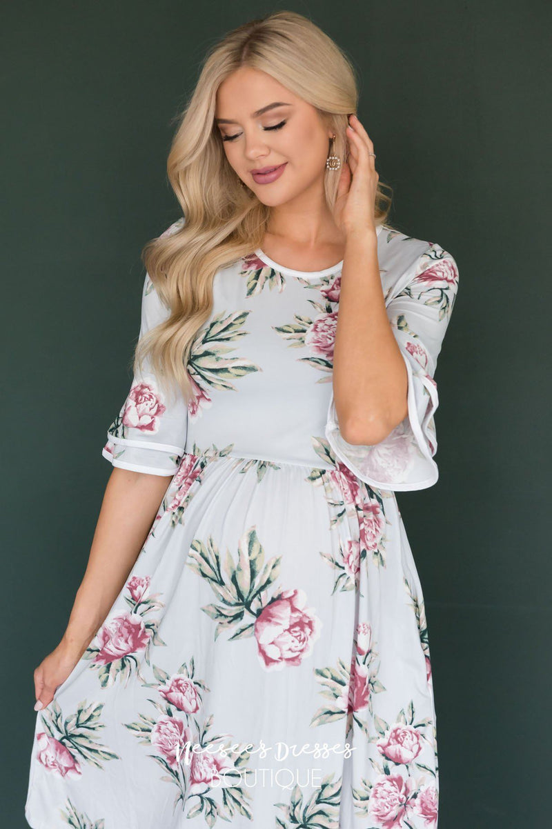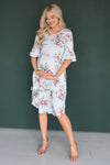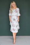 The Josslee is one of our new favorites! This classy feminine mid-length dress is sure to flatter! Featuring a ivory trim round neckline and flowy double bell half sleeves, elastic waist and pockets! You simply can not go wrong with this beauty!