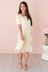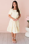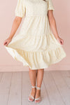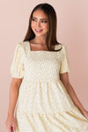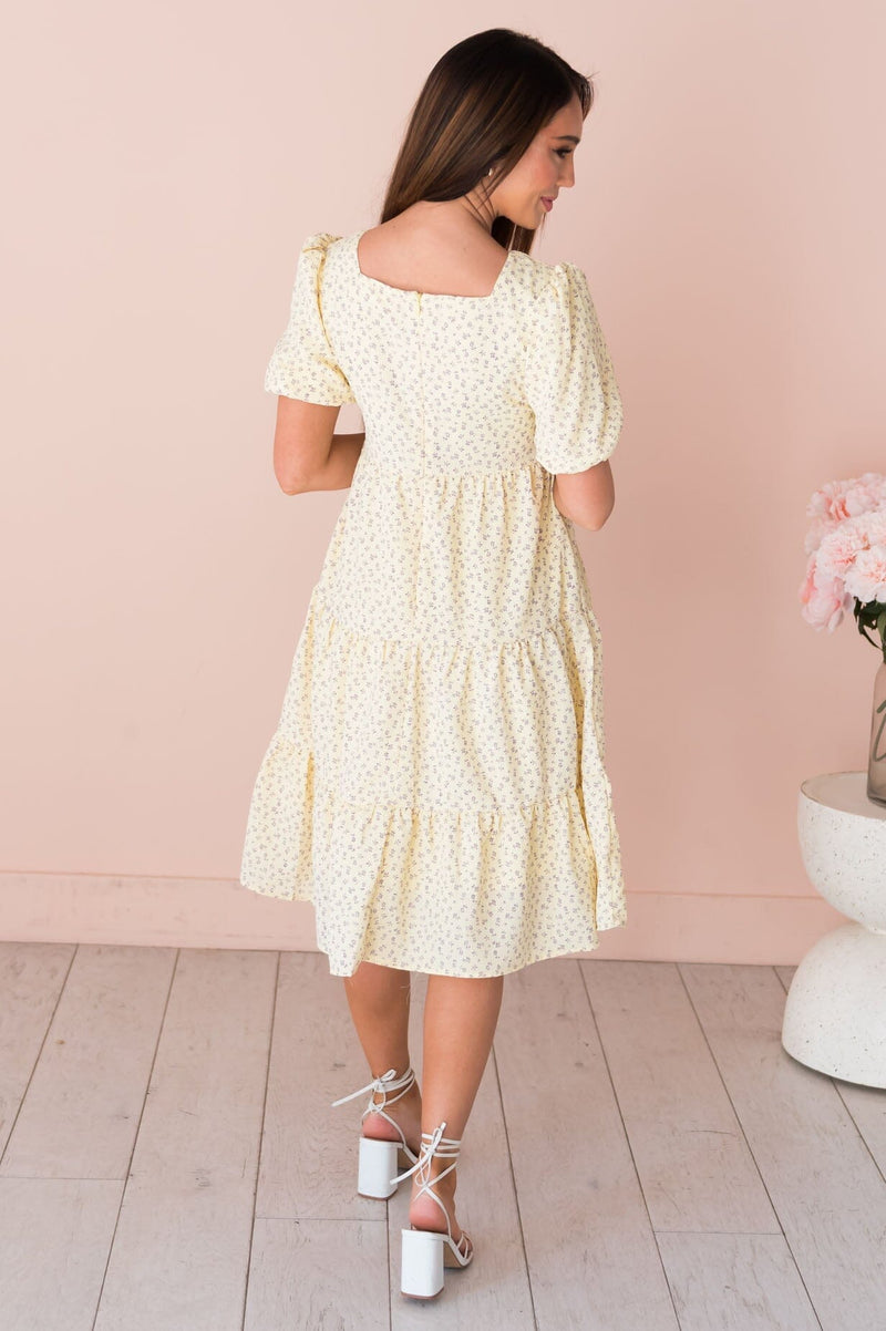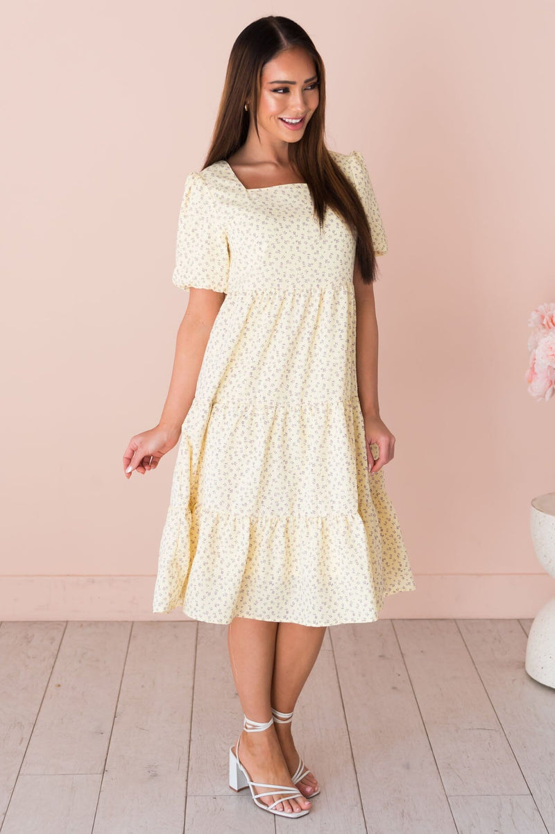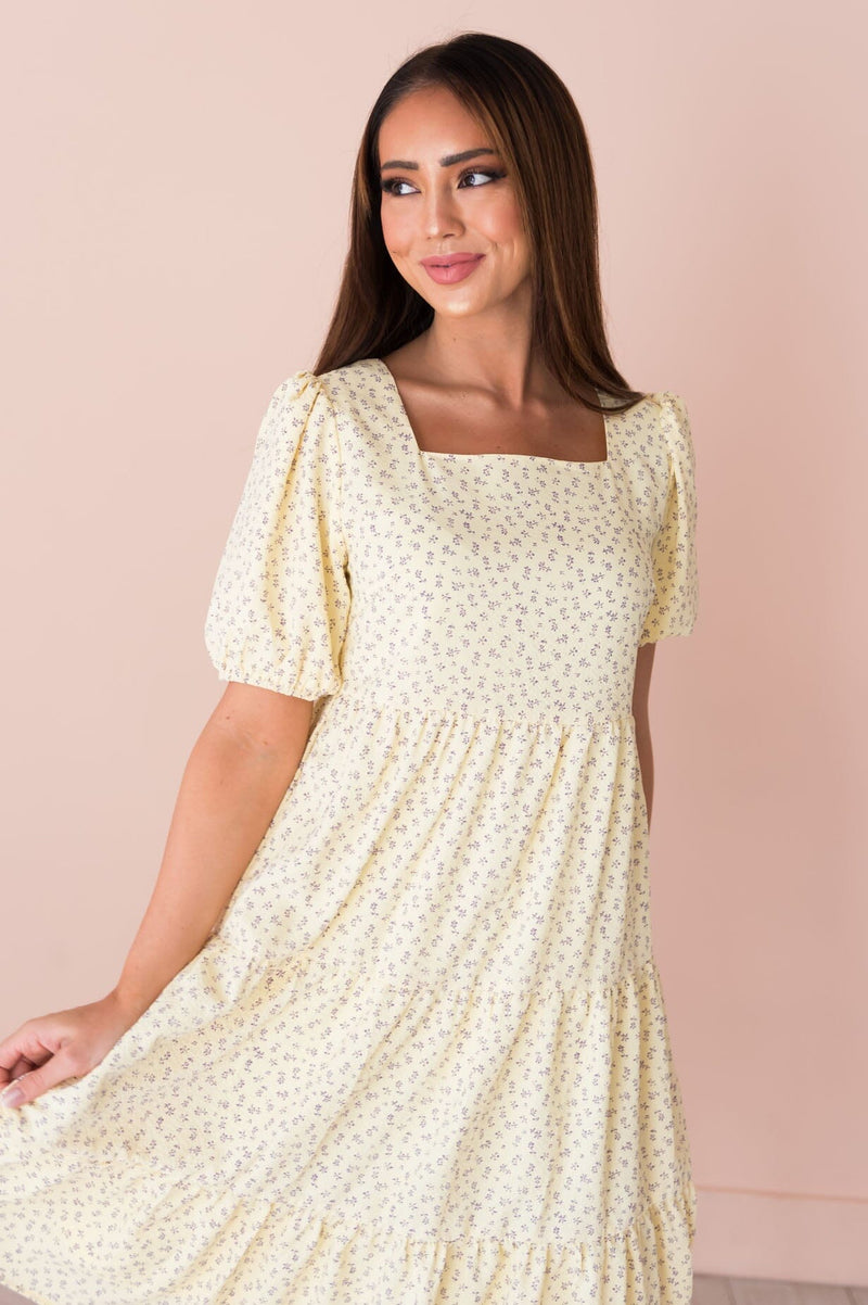 The Jubileah is a showstopper! This lovely floral features; a classy squared neckline, half length puff sleeves, tiered skirt and the most gorgeous light yellow color with lavender mini floral design. Get yours today!