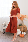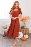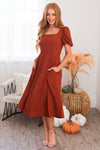 Meet our new, modest, Julee Dress. This dress will have you ready for all things Fall! Pretty as can be, this crepe fabric dress features a square neckline, short puff sleeves, pockets, a pretty perfect for Fall terracotta color, and a flattering flowy skirt.