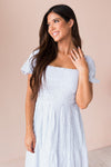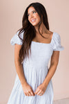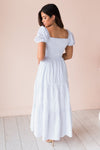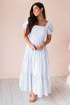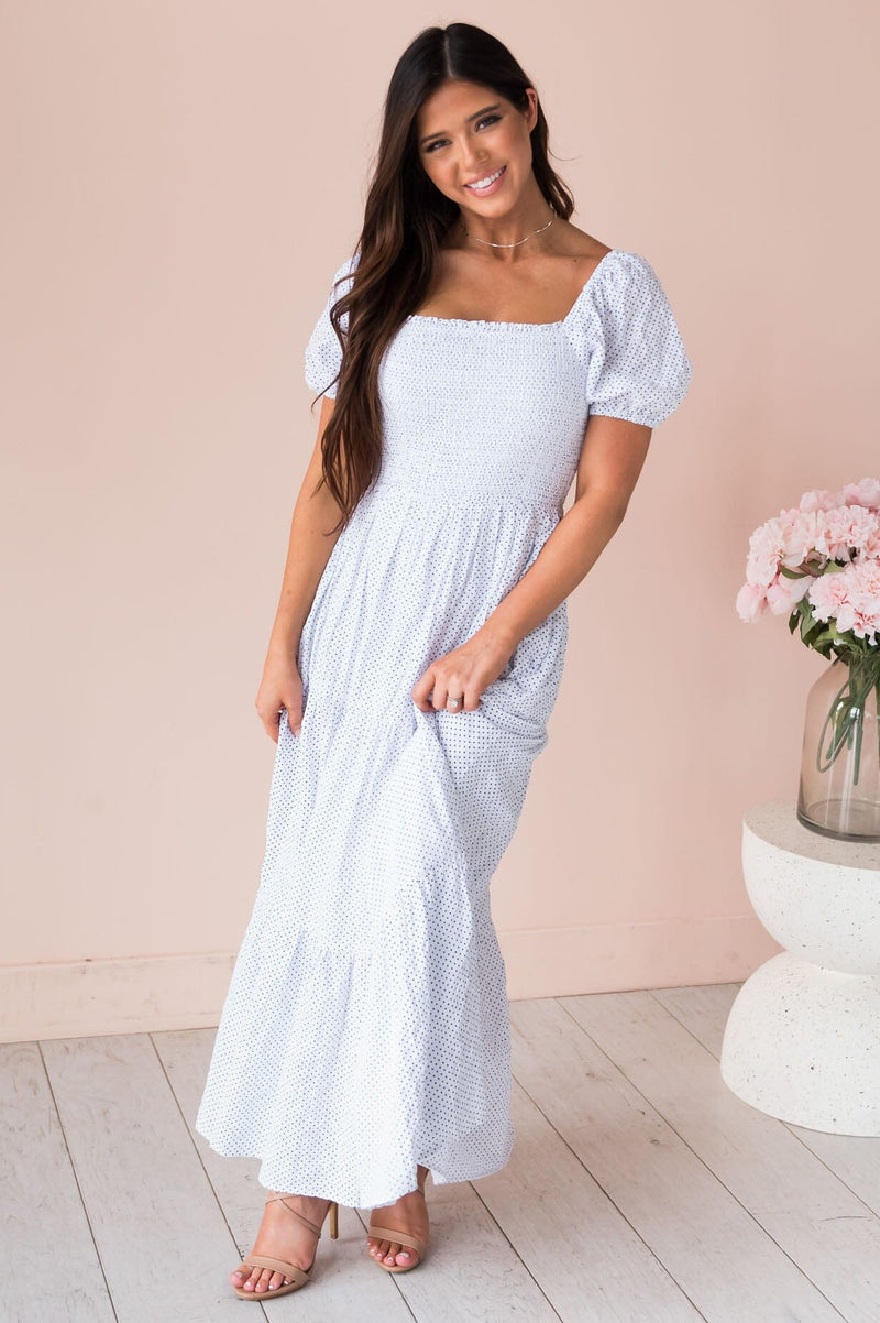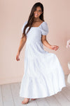 We have found the most beauty twirly addition for your wardrobe! The Juliann has stolen our hearts! Features include, a lovely white and navy mini star print, short puff sleeves, smocked bodice and our ever so favorite tiered maxi skirt! Get yours today!