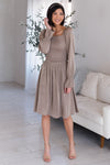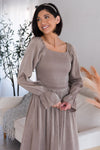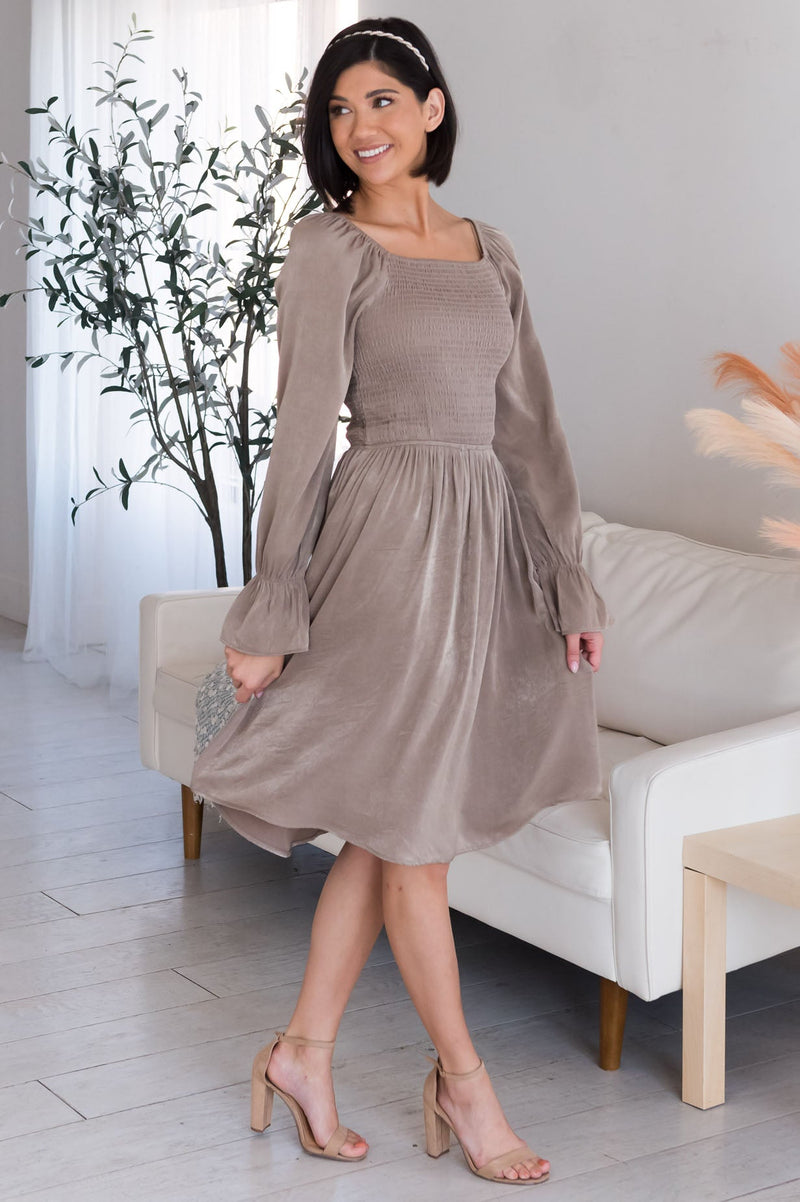 We are so excited about The Juliet! This dress is so perfect for any occasion! We love the flattering-to-all smocked bodice, flowy long cuffed ruffle sleeves, and the gorgeous classy warm taupe color! You will love this darling gem, get yours today!