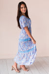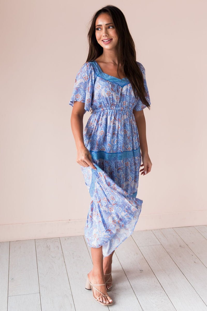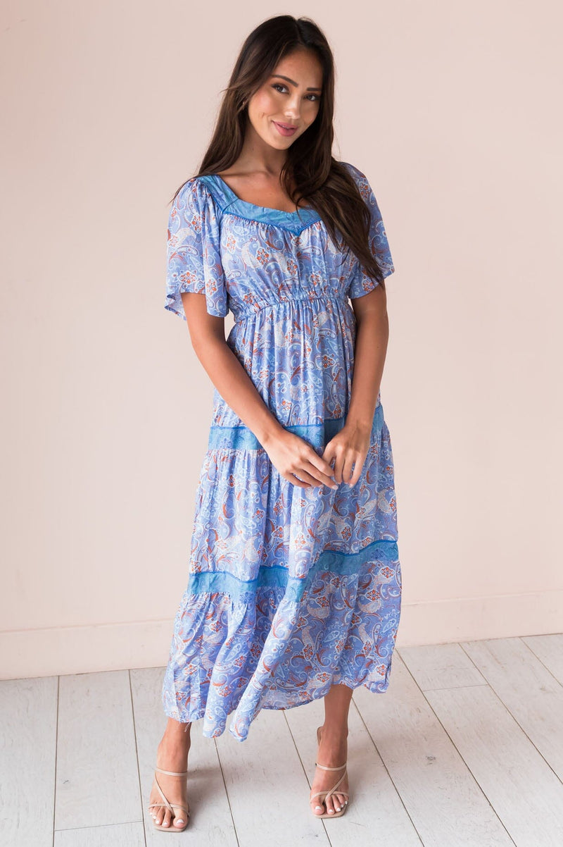 We are so excited to bring you the new Kahlani! This darling paisley print dress is bound to make an impact on your wardrobe! Features include a modest soft v-neckline, short sleeves, elastic waist and a tiered skirt. Get yours today!