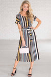 Well hello gorgeous! The Kasier is going to your new favorite dress to wear to all your special events you have coming up. We are in love with the color scheme of this dress the pastel stripes go so well with the black! It features a round neckline, elastic waistband, self tie belt detail, skirt is lined, cute keyhole back detail and our favorite part is it has pockets! This piece will definitely brighten up your wardrobe.