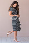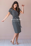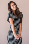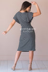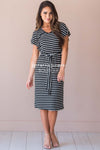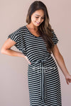 This striped dress is so darling! The Marley features an adorable v-neckline, feminine flutter sleeve detailing, and an adjustable built in belt with an elastic waistband. Not only is this dress stylish, it is also comfortable for all day wear! Spice up your work attire and add this dress to your wardrobe!