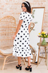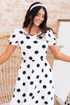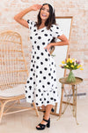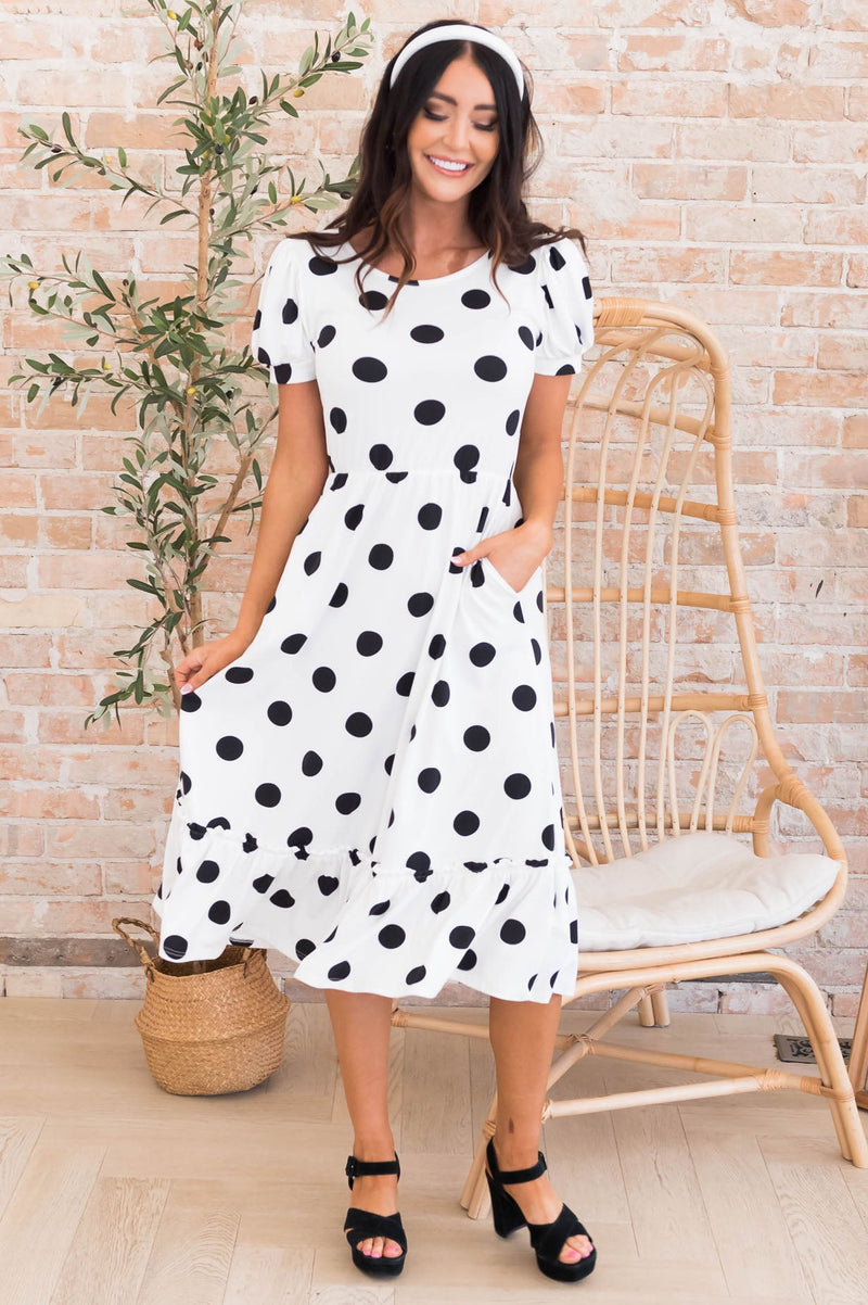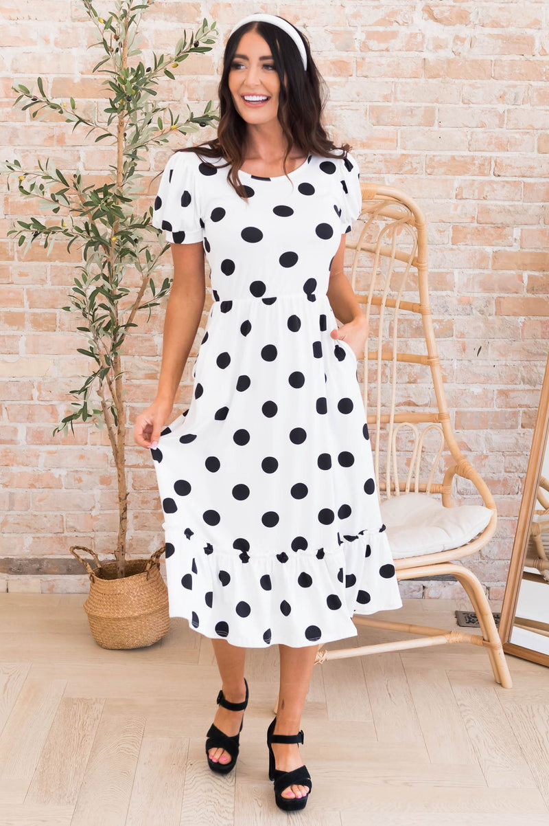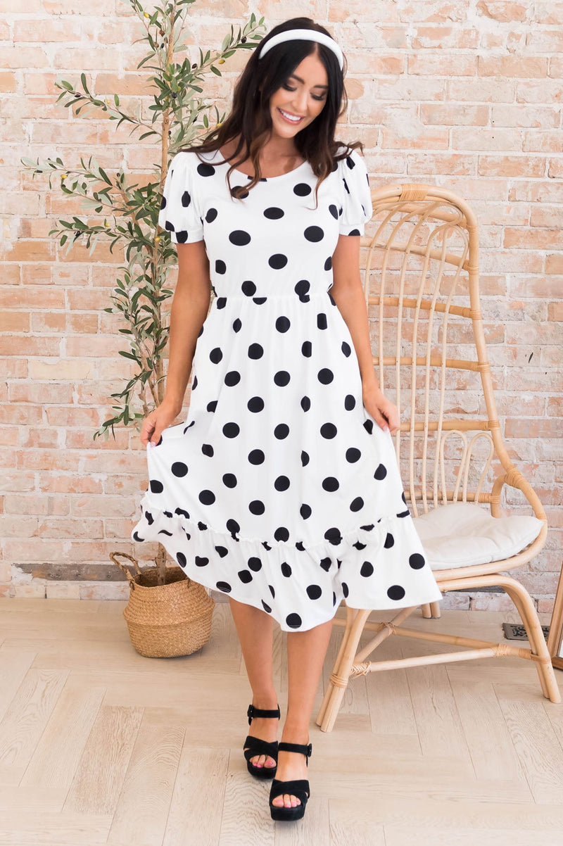 This modest polka dotted beauty checks all the boxes! Soft, classy, perfect for any occasion! Get yourself the KaliAnn today! Dress features as always, modest length in a gorgeous flowy ruffle hem skirt, rounded neckline, fitted bodice with a delicate short puff sleeves. Simply our new favorite!