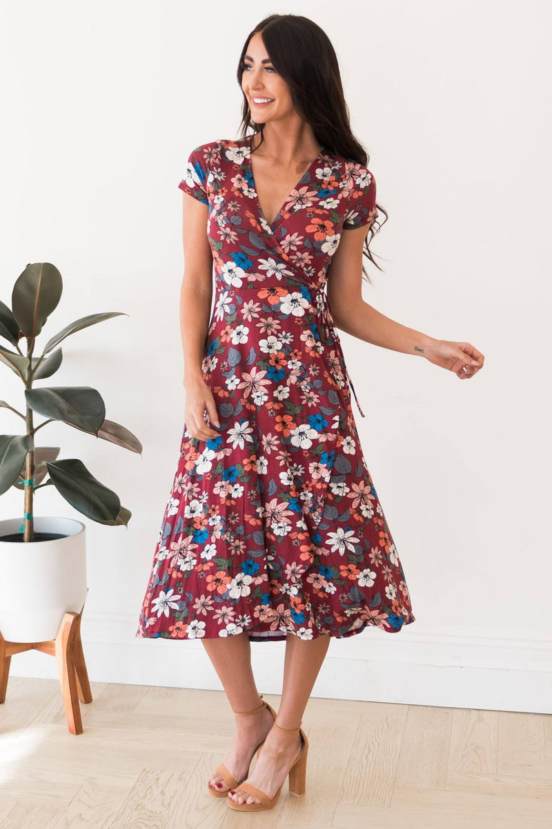 Do you love wrap style dresses? We have got a gorgeous one for you, the Kalisa is a lovely burgundy fall floral faux wrap style dress we simply fell in love with! Featuring short sleeves, elastic tie waist detail, and a faux wrap skirt. Get yours today, these beauties won't last long!