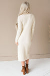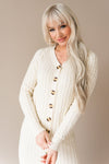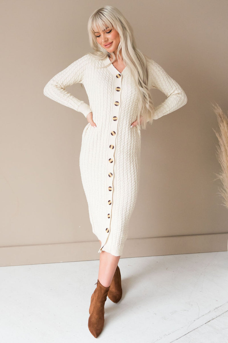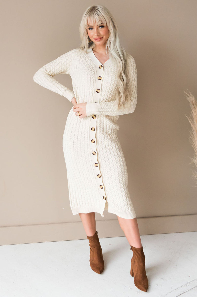 The Kalleen is seriously the most gorgeous sweater dress we've ever seen! Featuring a gorgeous oatmeal color, ribbed texture, super soft sweater material, long sleeves, and the classiest functional button front! Make sure to get yours soon!