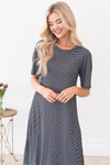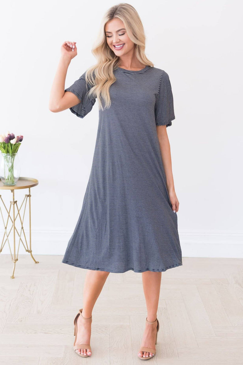 We are obsessed with swing dresses! So many reasons to be in love with the new Kallen! From the modest round neckline, short sleeves, light weight flowy material to the classy navy and ivory stripes. Get yours today!