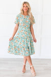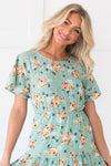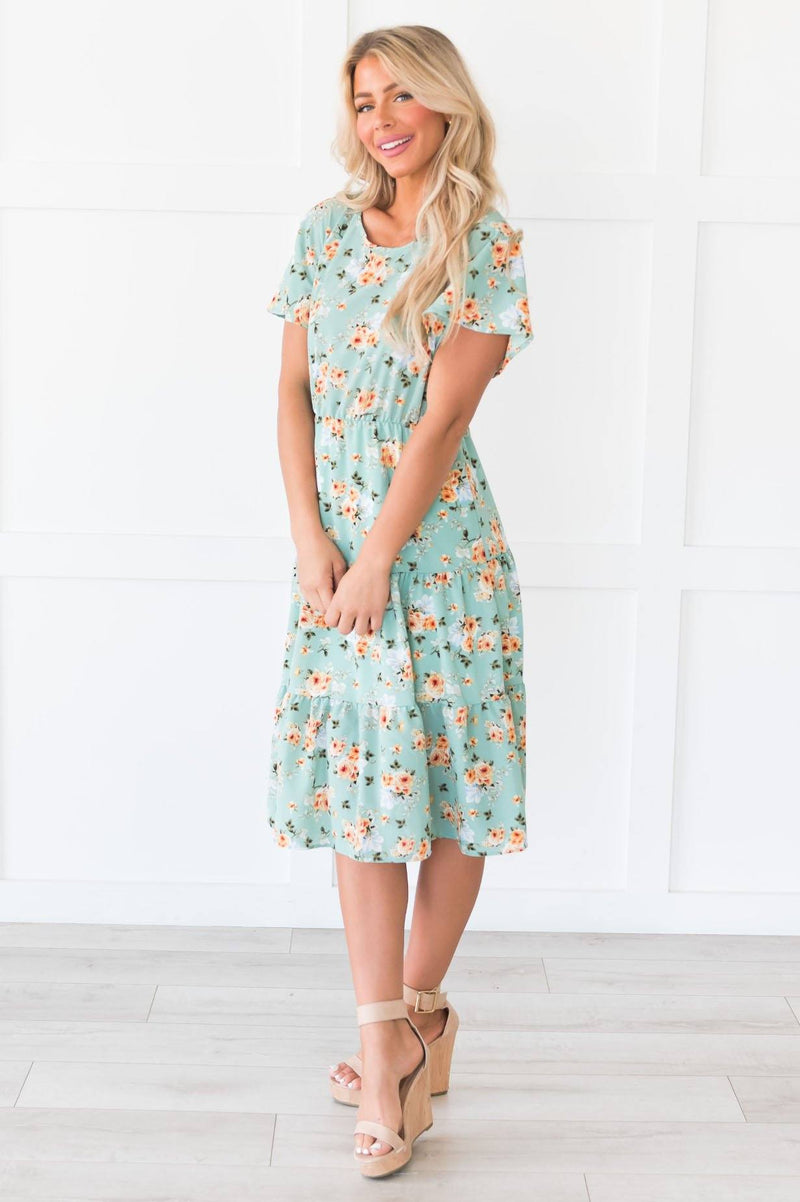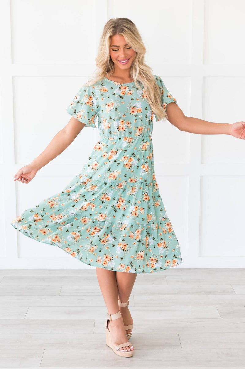 The lovely floral Kameron is here and ready to make all of your summer events a breeze! This modest mid-length dusty mint dress features a round neckline with keyhole button closure on the back, short flutter sleeves, elastic waist and a darling tiered full skirt. Get yours today, these will go fast!