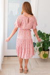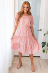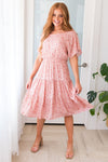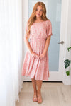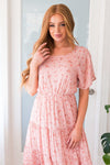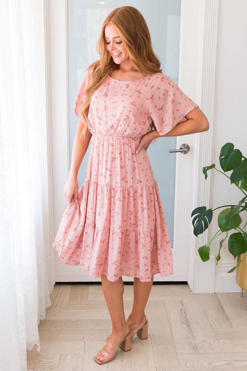 The lovely floral Kameron is here and ready to make all of your events a breeze! This modest mid-length dress features a round neckline with keyhole button closure, short flutter sleeves, elastic waist and a darling tiered full skirt in the most gorgeous swiss dot material. Get yours today, these will go fast!