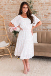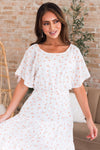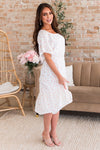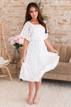 The lovely floral Kameron is here and ready to make all of your events a breeze! This modest mid-length dress features a round neckline with keyhole button closure, short flutter sleeves, elastic waist and a darling tiered full skirt in the most gorgeous swiss dot material. Get yours today, these will go fast!