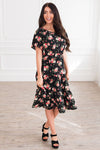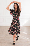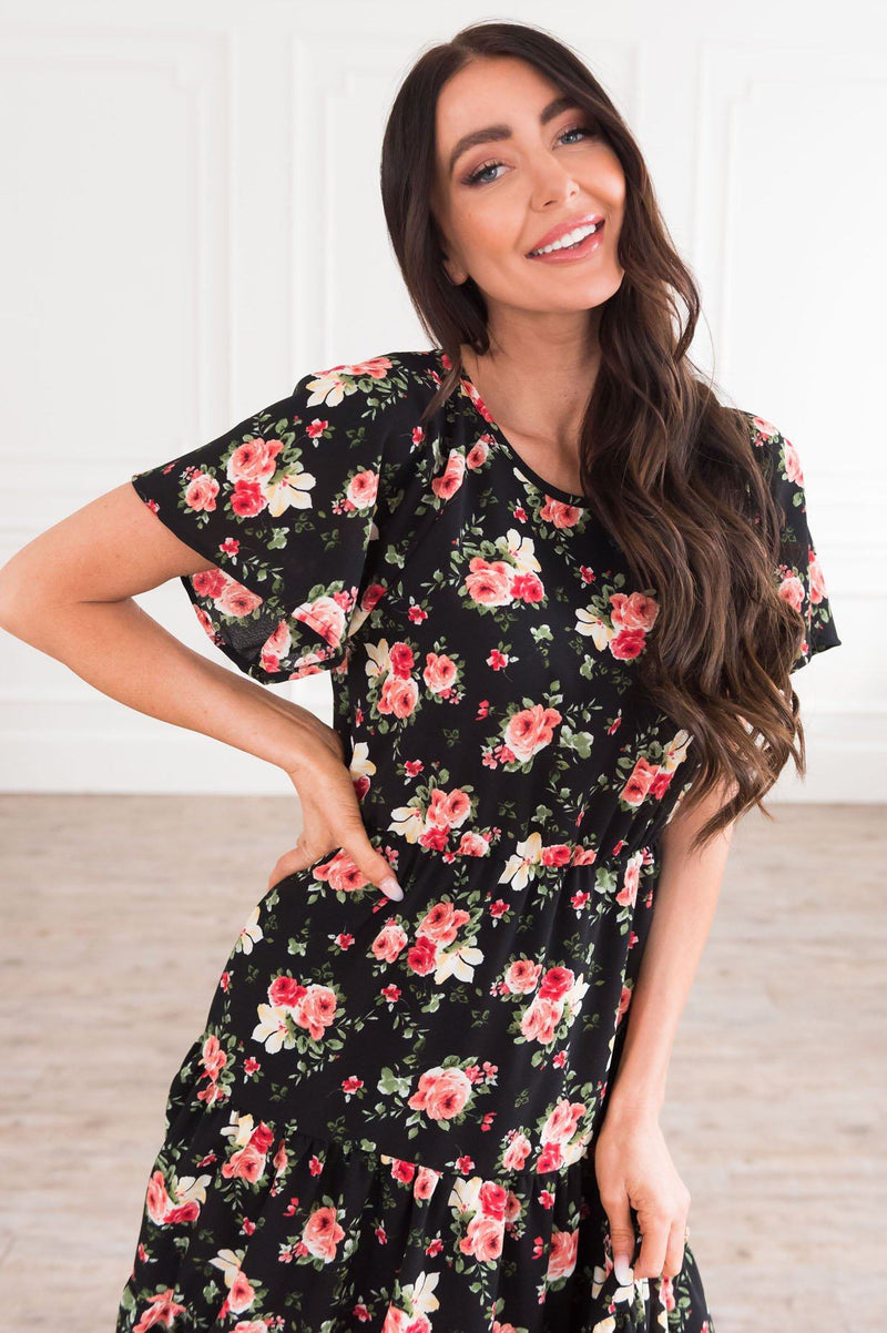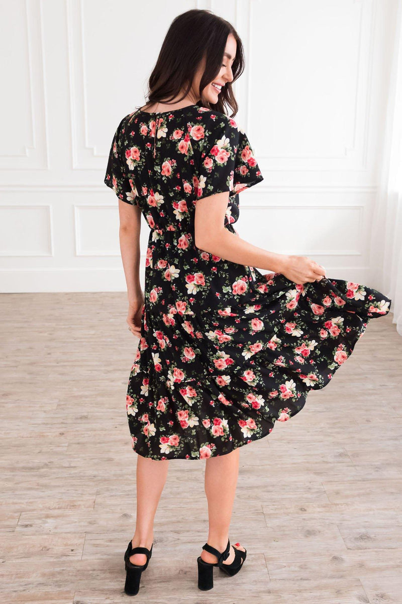 The lovely floral Kameron is here and ready to make all of your Spring and Summer events a breeze! This modest mid-length dress features a round neckline with keyhole button closure, short flutter sleeves, elastic waist and a darling tiered full skirt. Last but definitely not least, is this classy silky satin feel of this fabric! Get yours today, these will go fast!