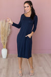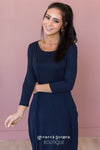 Our absolute new favorite! The Kami is perfection, this gorgeous mid-length dress features a modest round neckline, 3/4 length fitted sleeves, pockets, cozy soft stretch material, & our favorite shift style! These will go quick, get yours before they are gone!