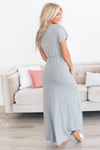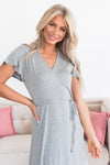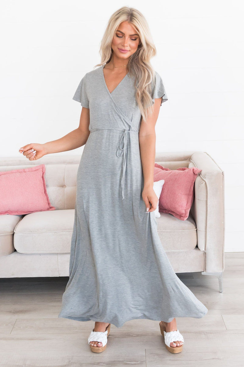 The Karey Modest Maxi Dress is absolutely stunning! This beautiful heather grey dress features a wrapped v-neckline, string tied waist, and the perfect modest maxi skirt! All of these details together create a modest and trendy design!