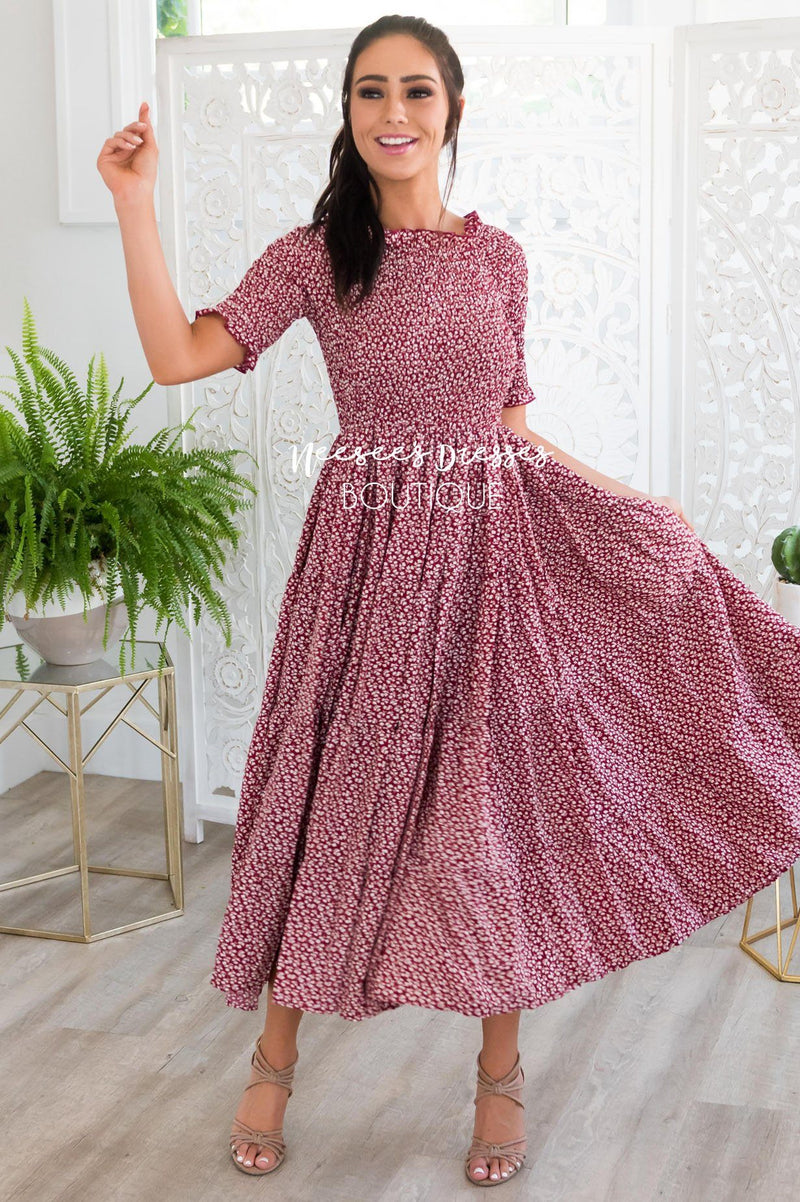 Fall is upon us and this is your perfect dress for it! The lovely shirred bodice with short sleeves is so flattering on everyone! Also featuring an elastic waist and a lovely flowy tiered tea length skirt. Trust us, this beauty is a must have!