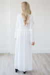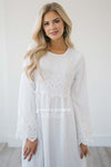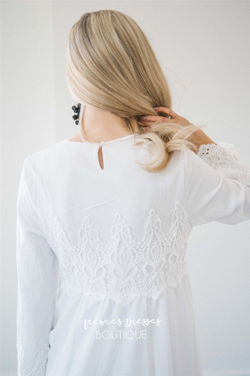 Beyond Beautiful! This white dress features lace detail across the bodice, long sleeves with lace scallop cuffs, a rounded neck line, an empire waist and a ling maxi skirt.