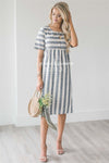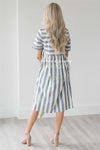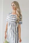 Cute, casual and comfy! This dress is a must have! This dust navy and oatmeal striped dress features a faux button front, contrasting stripes, half sleeves and a gathered waist.