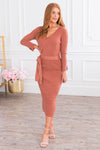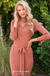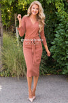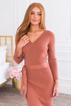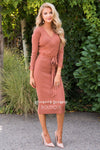 Sweater dresses are our favorite! So warm and classy at the same time! We especially love the Katina because it is nursing friendly too. We were so excited to offer it to you, we know it is hard to find in a sweater dress! Featuring long sleeves, fitted body crossover bodice, belt tie waist and fitted skirt. We also, can not get over the lovely toasted hazelnut color for the winter season! This dress is going to be a hit, get yours quick!