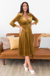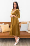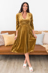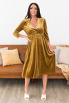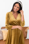 Our new Katja dress is classy, timeless, and oh-so lovely! We have never seen such beauty! It features a modest cross-over neckline, beautiful gold velvet, 3/4 length fitted sleeves, and a high elastic waistline. This dress is sure to sell out, so hurry and gets yours today