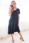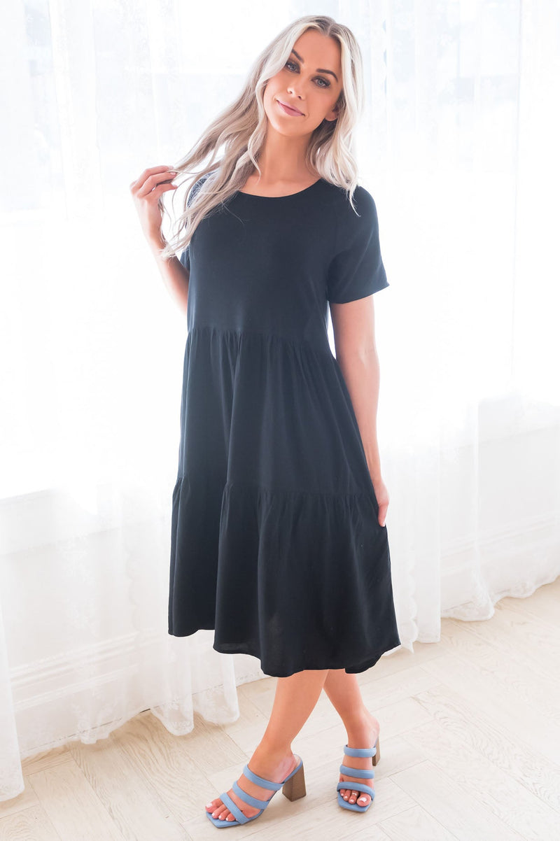 We are so excited about The Kaytlynn! This dress is so perfect for any occasion! We love the modest round neckline, flowy short sleeves, and the perfect black color. Trust us when we say this dress is a must have!