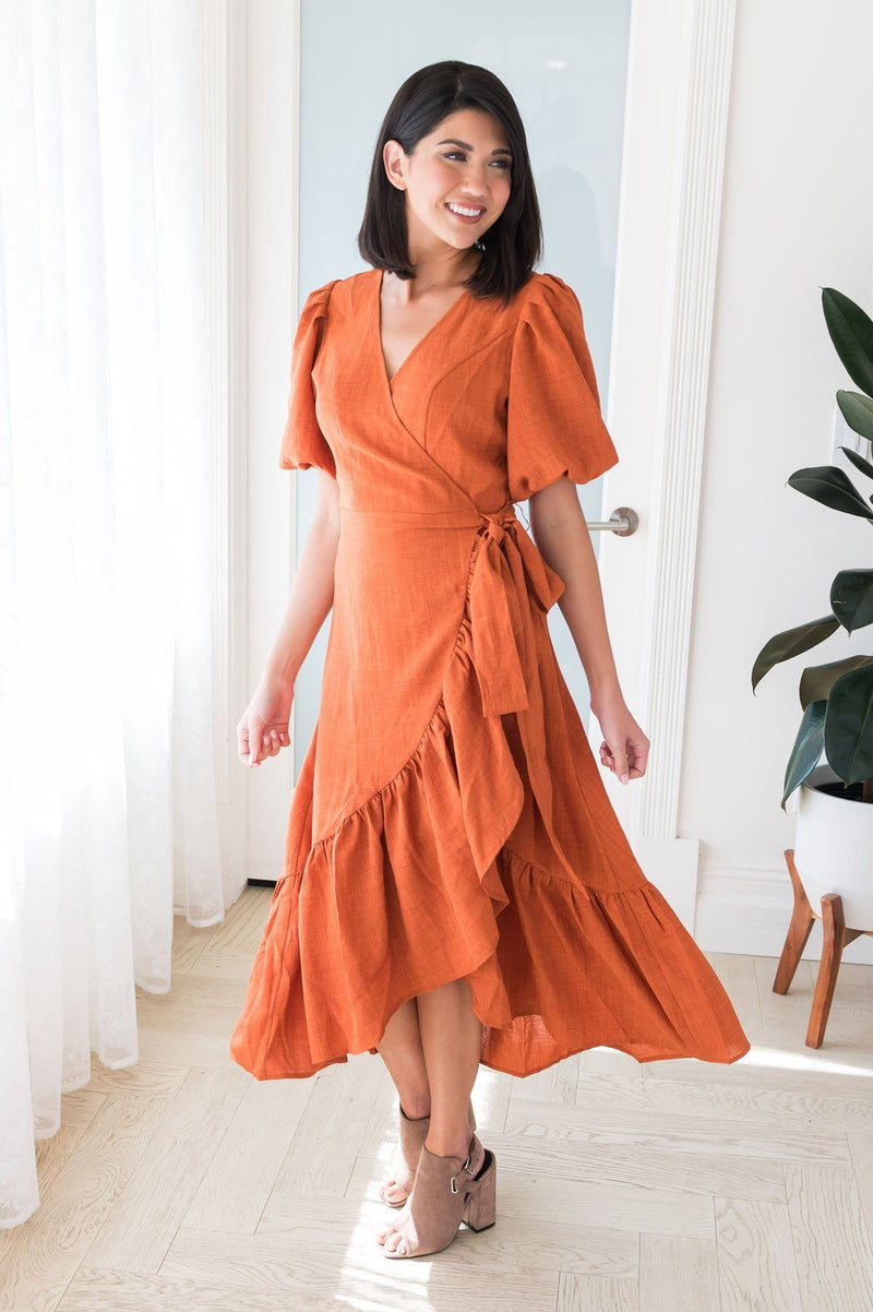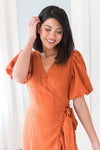 The Kehlani is truly the most gorgeous wrapped dress we've ever seen! Featuring a gorgeous ginger color, beautiful short puff sleeves, a wrapped bodice that makes it nursing friendly, and a wrapped skirt with a ruffled hi-low hem! We truly can't get enough of this stunning dress!