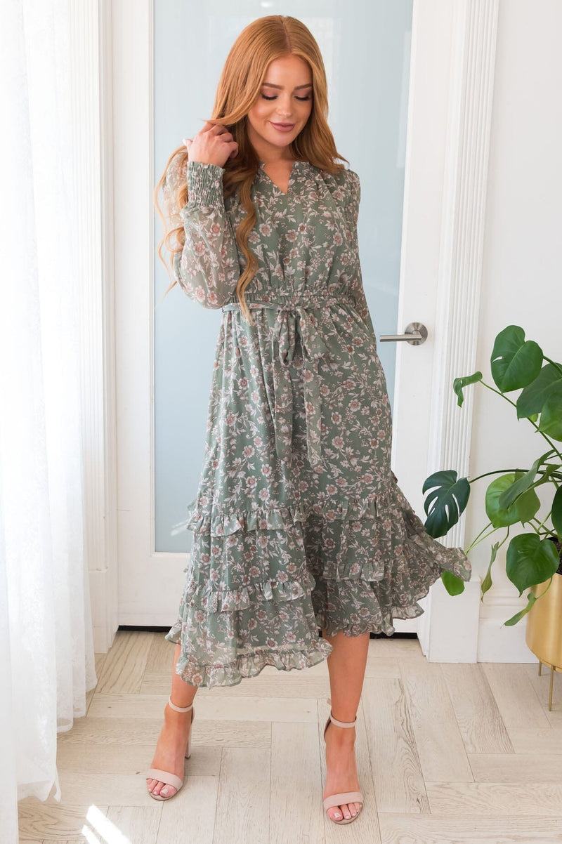 This flowy ruffled must have dress is begging to be a part of your wardrobe! We are obsessed with the lovely floral, feminine ruffled details, long cuffed sleeves, belt tie waistline and the perfect flowy ruffle detailed skirt! Get yours today!