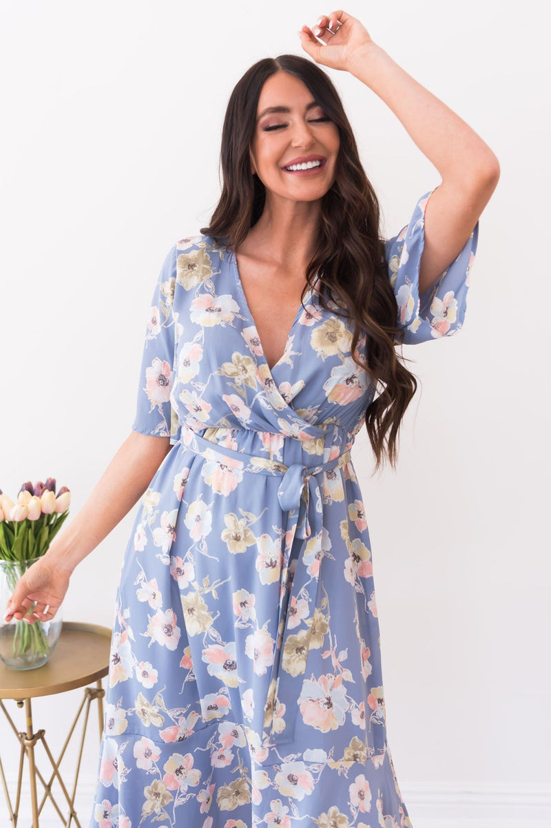 Talk about a catch, the New Keira is one for sure! Featuring lovely flowy half flutter sleeves, cross-over bodice, elastic belt tie waist and our favorite feature of all, the feminine ruffle high-low hemline. This modest beauty is a must have!