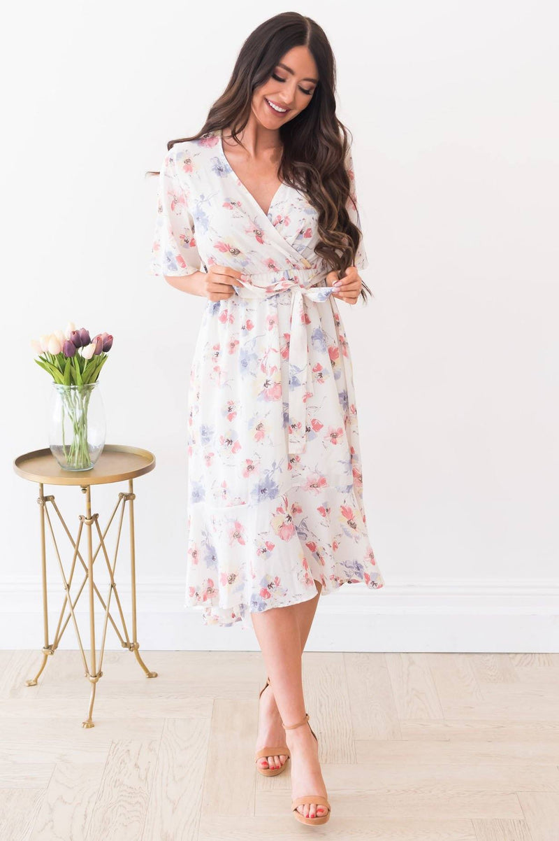 Talk about a catch, the New Keira is one for sure! Featuring lovely flowy half flutter sleeves, cross-over bodice, elastic belt tie waist and our favorite feature of all, the feminine ruffle high-low hemline. This modest beauty is a must have!