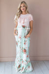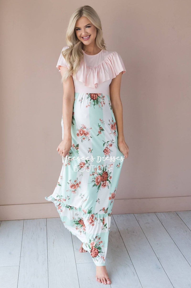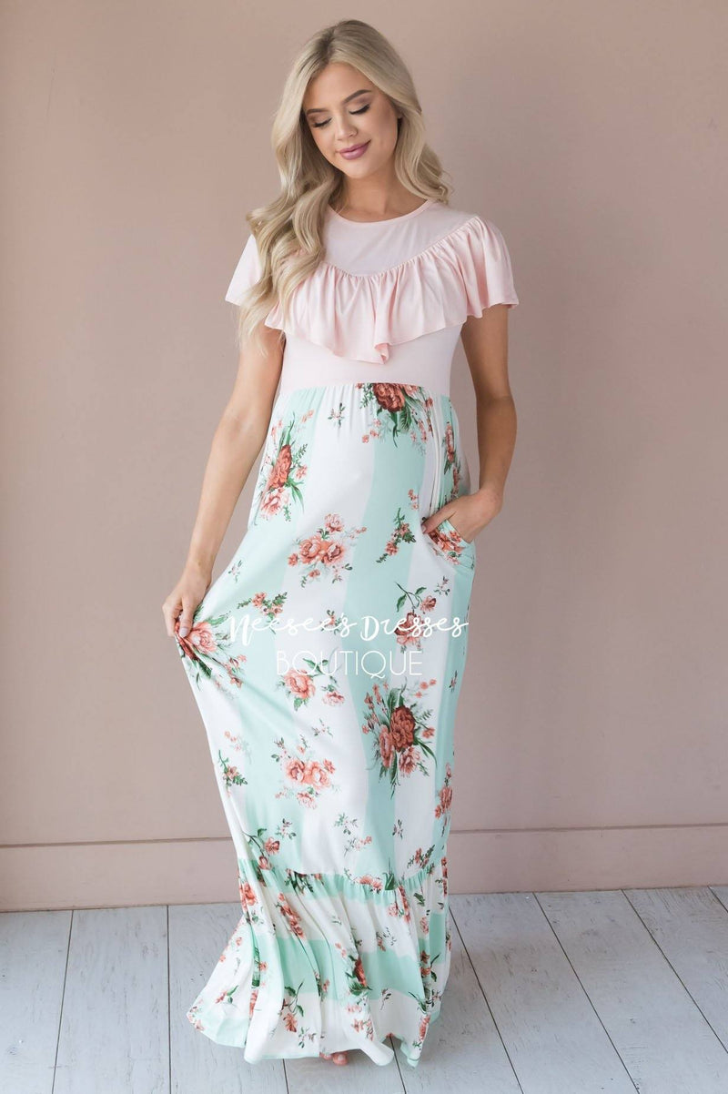 Twirl into Spring in this lovely maxi dress! We are loving the two toned style of this dress, it create the perfect spring image! Featuring an adorable blush pink ruffle bodice, a ruffle short sleeve, fitted elastic waist plus a mint striped floral maxi skirt. This dress also has side seam pockets.