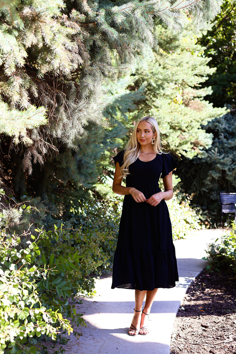 The Kendall modest dress is perfect from top to bottom! We adore this gorgeous classic black beauty has a modest smocked bodice, short flutter sleeves, pockets and a feminine ruffle hem skirt! This darling dress is seriously perfect for any season, grab yours today!