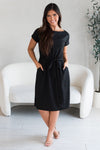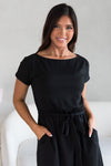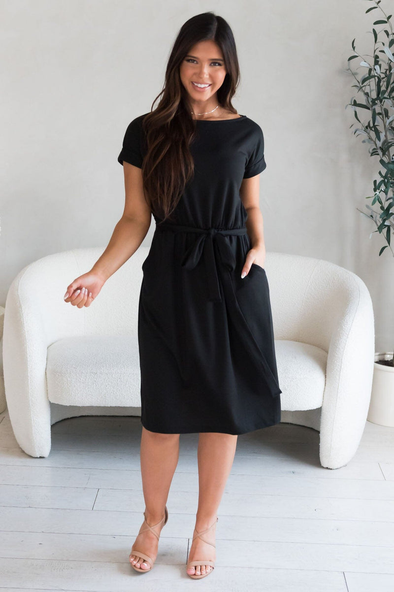 This knitted beauty is as classy as they come! There is nothing not to love about this casual beauty. Featuring short cuffed sleeves, a belt tie waist, pockets, and gorgeous classic black color. We are absolutely in love with this new arrival!