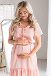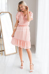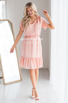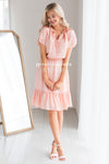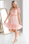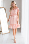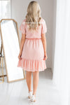 We are absolutely in love with our gorgeous ruffle dress! The soft peach color had us starstruck from the moment we saw it! Also features a double ruffle round neckline with tie, short double flutter sleeves, elastic waist and a ruffle hemline. You are going to need this piece added to your dress collection!