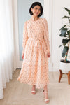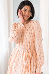 Our new, modest, Kensington Dress, is truly stunning. Dress like a princess in this tutu pink dress. Made from the highest quality materials, this dress features flatting long sleeves, a round neckline, a loose fit with a waist tie sash for adjustable structure, a tiered hemline and the prettiest, sparkly silver and copper threading details. Back zipper closure.