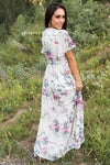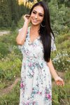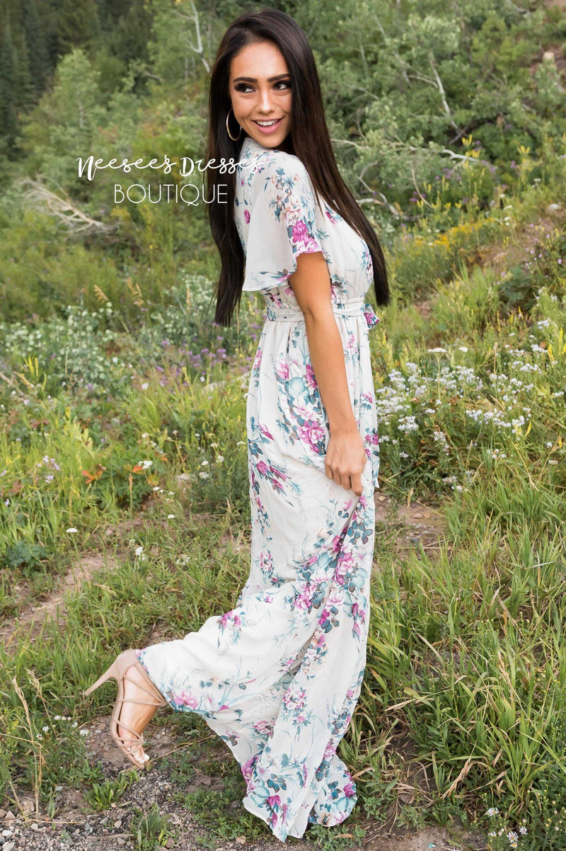 This lovely feminine beauty stole our hearts! Featuring a cross over bodice with snap button closure, short flutter sleeves, belt tie waist and flowy ruffle hemline skirt. We can not get over this gorgeous floral print too!