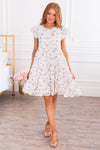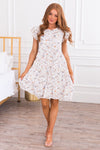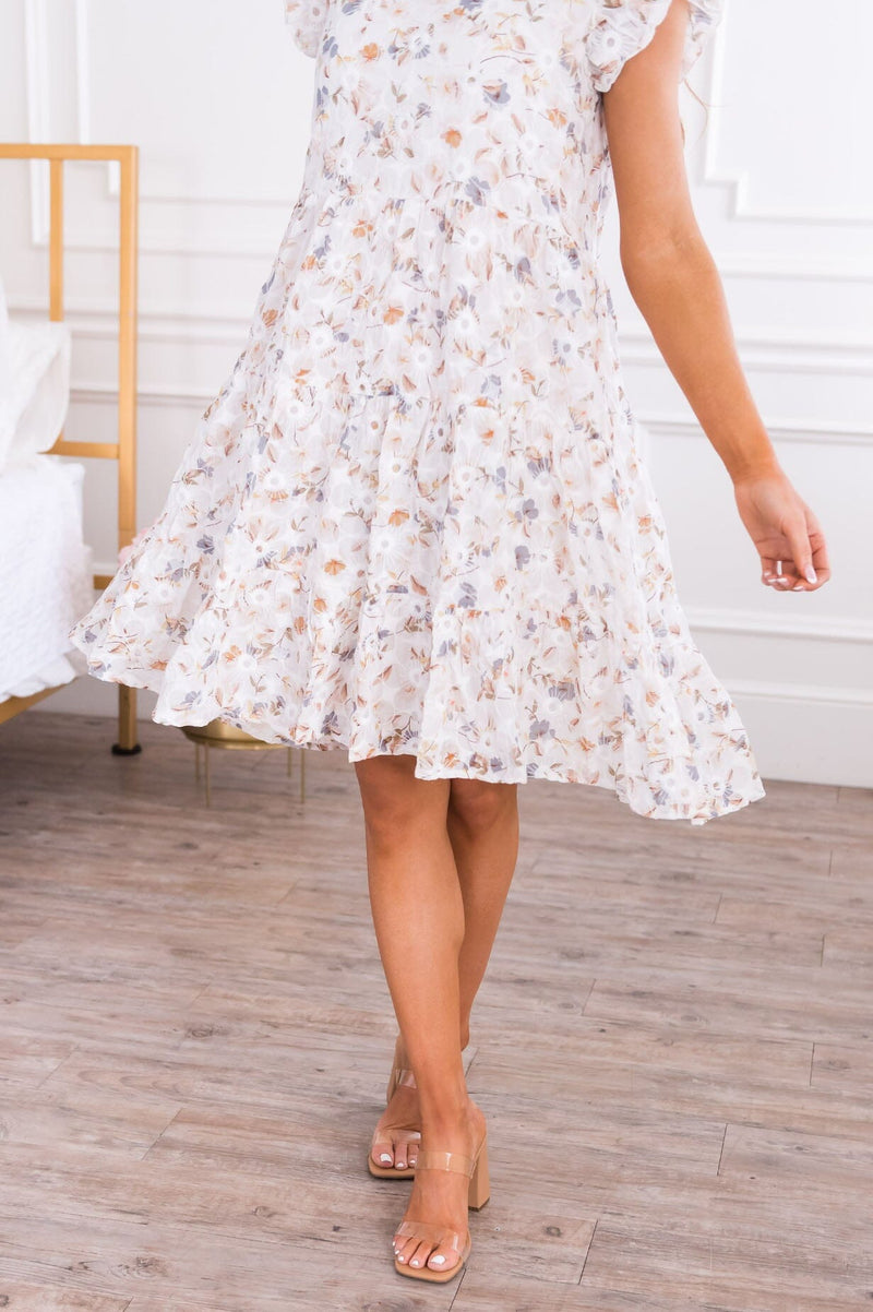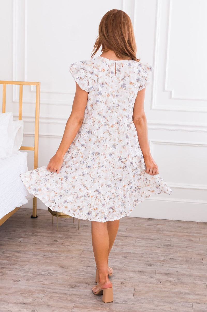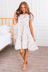 The Kerrian is a wardrobe must have! Featuring the most feminine flowy fit & delicate embroidered details! We love the short flutter sleeves, rounded ruffled neckline and tiered mid-length skirt. Get yours today!