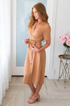 This flattering dress is sure to catch everyone's eye! Our new, modest, Khora Dress, features a collared neckline, functioning front buttons (ideal for nursing mothers) and a wrap waist tie detail.