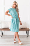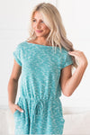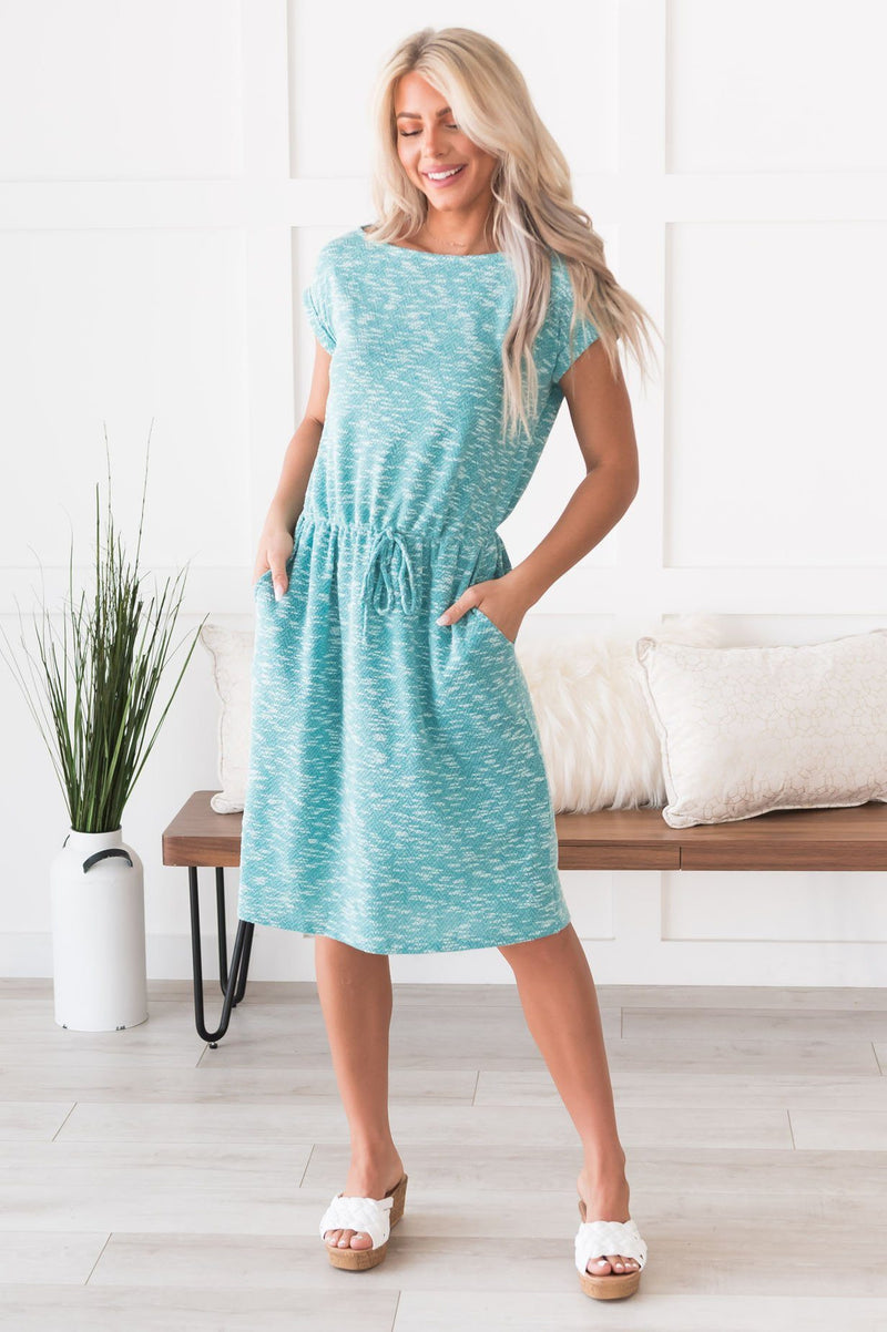 This knitted beauty Kia is as cute as they come! There is nothing not to love about this casual beauty. Featuring short cuffed sleeves, an elastic tied waistline, pockets, and gorgeous teal color with white knitting throughout! We are absolutely in love with this new arrival! Made in the U.S.A