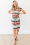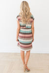 The Kia stripped dress is here and perfect in everyway! This multi-colored dress has so many great details! The tie waist and pockets are fashionable and functional! The large blocked striped pattern is sure to be the star of the show!