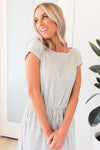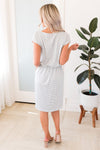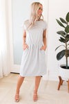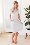 This new Kia is as cute as they come! There is nothing not to love about this new beauty. Featuring short cuffed sleeves, an elastic tied waistline, pockets, and gorgeous ivory and grey striped color combo! We are absolutely in love with this new arrival!