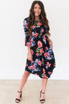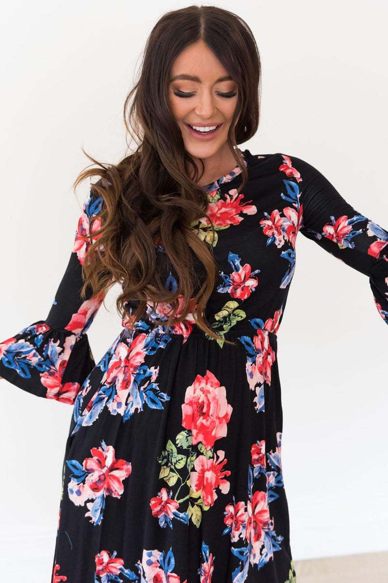 The Kianna is the perfect dress for summer! This gorgeous black dress has large floral print, lightweight material, long bell sleeves, elastic waist, and a curved hemline. You're going to want this beautiful floral dress in your wardrobe!