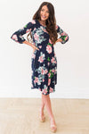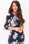 The Kianna is the perfect dress for summer! This gorgeous dark navy dress has large pink and green floral print, lightweight material, long bell sleeves, elastic waist, and a curved hemline. You're going to want this beautiful floral dress in your wardrobe!